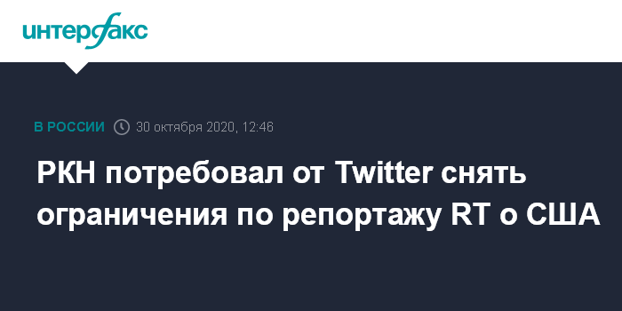 Москва. 30 октября. INTERFAX.RU - Роскомнадзор обратился в Twitter с требованием снять ограничения по репортажу телеканала Russia Today о нарушениях во время проведения выборов в США.