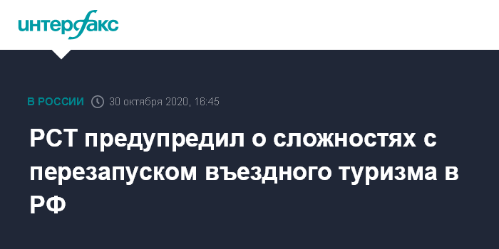 Москва. 30 октября. INTERFAX.RU - Въездной туризм России перезапустить будет сложнее всего, на это уйдет как минимум полгода после возобновления авиасообщения со странами, сообщил президент Российского союза туриндустрии (РСТ) Андрей Игнатьев.