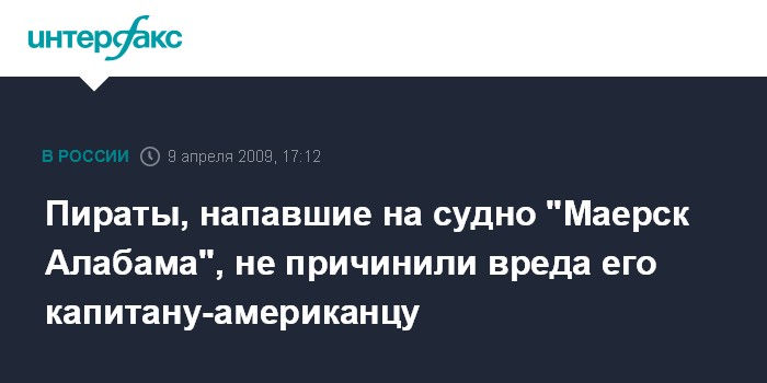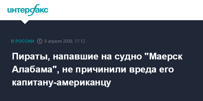 Москва. 9 апреля. INTERFAX.RU - Капитан датского сухогруза "Маерск Алабама" с американскими моряками на борту, подвергшегося нападению сомалийских пиратов, до сих пор остается в заложниках, однако вред его здоровью причинен не был, сообщил в четверг американский телеканал CNN со ссылкой на представителя американского филиала компании "Маерск" Кевина Спирса.