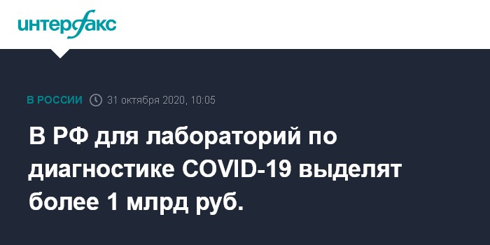 Москва. 31 октября. INTERFAX.RU - Премьер-министр России Михаил Мишустин подписал распоряжение о выделении 1 млрд рублей на оснащение лабораторий для диагностики COVID-19, сообщила в субботу пресс-служба правительства.