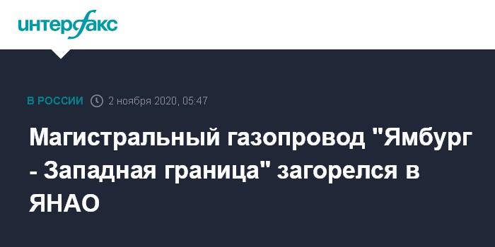 Москва. 2 ноября. INTERFAX.RU - Разрыв с возгоранием произошел 2 ноября в 00:45 по Москве на 59-км магистрального газопровода "Ямбург - Западная граница СССР", сообщает Ситуационно-аналитический центр Минэнерго России.