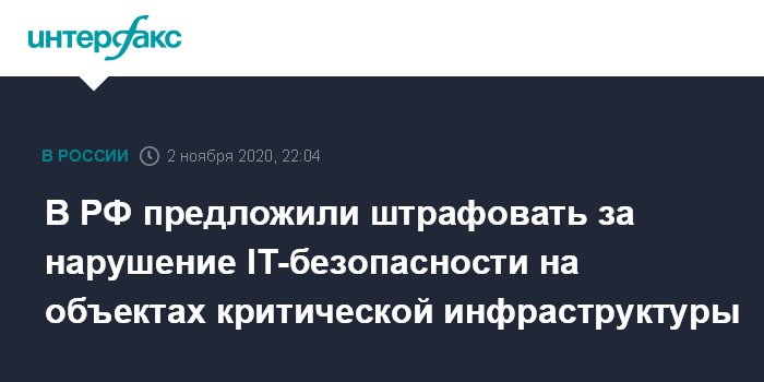 Москва. 2 ноября. INTERFAX.RU - Правительство РФ в понедельник внесло в Госдуму законопроект, предусматривающий введение штрафов за нарушения требований к системам безопасности значимых объектов критической информационной инфраструктуры (КИИ) РФ.
