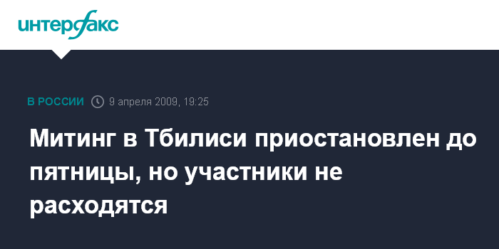 Тбилиси. 9 апреля. INTERFAX.RU - Один из лидеров оппозиции Леван Гачечиладзе заявил собравшимся на площади перед зданием парламента Грузии, что "активная фаза митинга приостановлена до 16:00 пятницы, 10 апреля".