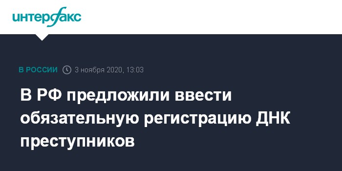 Москва. 3 ноября. INTERFAX.RU - Правительство России внесло в Госдуму законопроект, согласно которому обязательной регистрации ДНК будут подлежать осужденные и подозреваемые в преступлениях; это приведет к увеличению базы данных геномной информации в несколько раз к 2023 году.