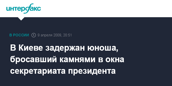 Киев. 9 апреля. INTERFAX.RU - Сотрудники Печерского райуправления милиции Киева в четверг вечером задержали молодого человека, который бросил несколько камней в здание секретариата президента Украины.