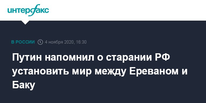 "Вы знаете, Россия делает все, что от нас зависит, чтобы конфликт на Южном Кавказе был завершен - и как можно быстрее, чтобы сохранить жизни людей, которые стоят друг напротив друга и, к сожалению, до сих пор видят друг друга в прицелах автоматов, винтовок, используют друг против друга оружие для достижения тех целей, которых, по нашему глубокому убеждению, можно было достичь в ходе мирного переговорного процесса", - сказал Путин в среду на встрече с представителями религиозных объединений в День народного единства.