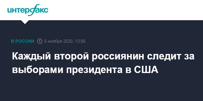 Москва. 5 ноября. INTERFAX.RU - Больше половины россиян (53%) уделяют внимание новостям о президентских выборах в США, 26% граждан РФ прочат победу действующему главе государства Дональду Трампу, свидетельствуют данные опроса Фонда "Общественное мнение" (ФОМ), поступившие в четверг в "Интерфакс".