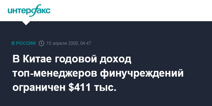 Пекин. 10 апреля. ИНТЕРФАКС-КИТАЙ - В Китае решением министерства финансов введены ограничения на годовые доходы руководящего состава государственных финансовых учреждений.