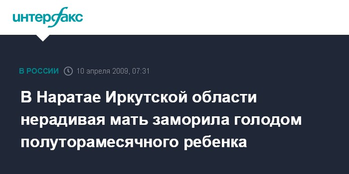 Иркутск. 10 апреля. ИНТЕРФАКС-СИБИРЬ - Саянский межрайонный следственный отдел Следственного управления СКП РФ по Иркутской области по факту гибели полуторамесячного мальчика возбудил уголовное дело против его 35-летней матери.