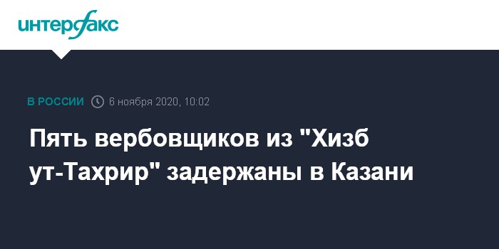Москва. 6 ноября. INTERFAX.RU - ФСБ сообщает о задержании в Казани пяти членов запрещенной в РФ террористической организации "Хизб ут-Тахрир аль-Ислами", занимавшихся вербовкой среди мусульман Татарстана.