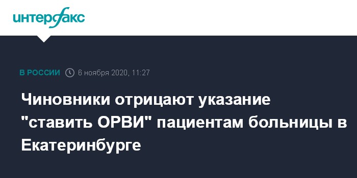 Москва. 6 ноября. INTERFAX.RU - В центральной городской больнице №7 Екатеринбурга не было внутренних распоряжений ставить всем пациентам диагноз "ОРВИ" вместо "коронавирусной инфекции", заявили "Интерфаксу" в оперативном штабе Свердловской области.