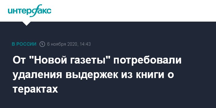 Ранее в ряде телеграм-каналов была опубликована информация о том, что Генпрокуратура направила в Роскомнадзор требования об удалении с сайта "Новой газеты" выдержек из книги "ФСБ взрывает Россию", которая решением Хорольского суда Приморского края 12 января 2015 года признана экстремистским материалом и включена в федеральный список экстремистских материалов.