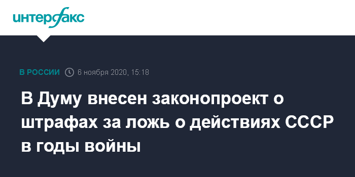 Москва. 6 ноября. INTERFAX.RU - В Госдуму внесен законопроект о штрафах до трех миллионов рублей за распространение заведомо ложных сведений о деятельности СССР в годы Второй мировой войны.