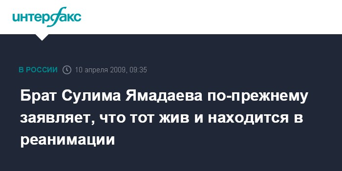 Москва. 10 апреля. INTERFAX.RU - Бывший командир батальона ГРУ "Восток" Сулим Ямадаев по-прежнему находится в реанимации, сообщил его брат Иса Ямадаев.