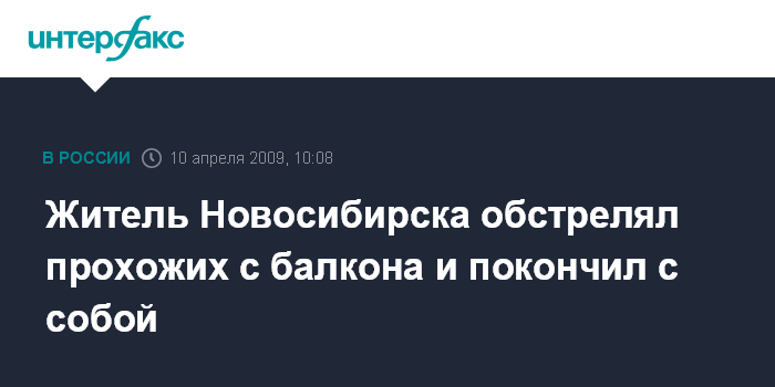 Москва. 10 апреля. INTERFAX.RU - В Кировском районе Новосибирска 43-летний мужчина рано утром в пятницу открыл стрельбу по прохожим с балкона дома, где он проживал, убита женщина.