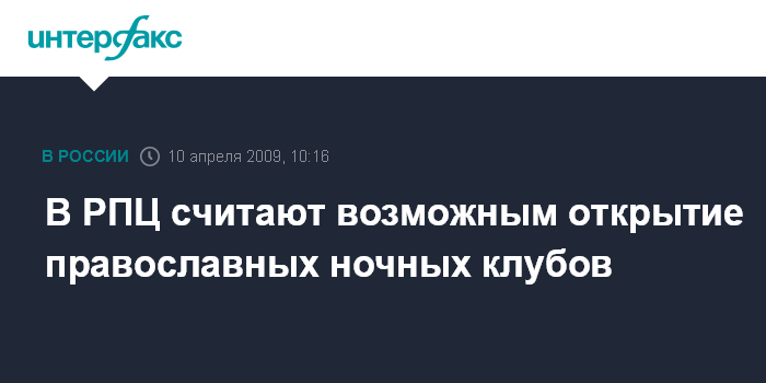 Москва. 10 апреля. INTERFAX.RU - В Московском патриархате не исключают возможности открытия православных ночных клубов как дополнительных мест общения верующей интеллектуальной молодежи.