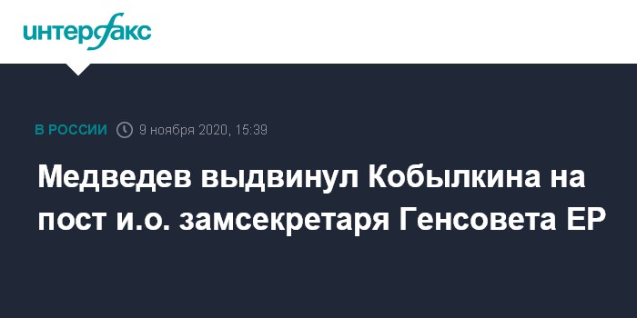 Москва. 9 ноября. INTERFAX.RU - Председатель "Единой России" Дмитрий Медведев предложил президиуму Генерального совета партии кандидатуру Дмитрия Кобылкина на должность исполняющего обязанности заместителя секретаря Генсовета ЕР, сообщили в пресс-службе партии в понедельник.