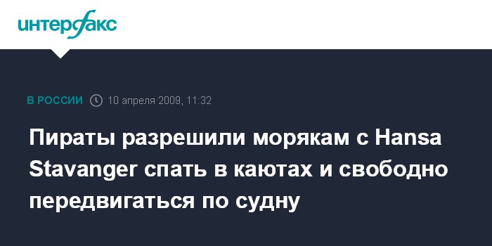 Москва. 10 апреля. INTERFAX.RU - Члены экипажа захваченного сомалийскими пиратами немецкого танкера Hansa Stavanger, среди которых трое граждан РФ, чувствуют себя хорошо, на судне есть все необходимые медикаменты, сообщает в пятницу пресс-служба МИД Украины со ссылкой на капитана судна.