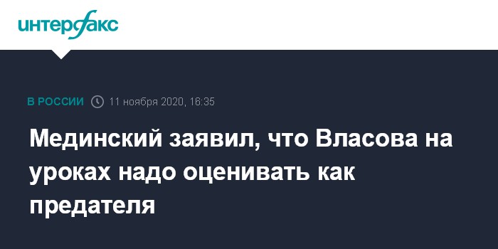 "Нужно объяснять школьникам, что было два известных командарма - Власов и воевавший с ним бок о бок командарм (Михаил - ИФ) Ефремов. Оба попали в одинаковую ситуацию, оба были окружены и с боями пытались как-то пробиться. И когда истощились ресурсы у Власова, он добровольно пошел вместе со своим начальником штаба и сдался в плен немцам. До этого будучи вполне себе обласканным советской властью и мысли никогда плохой ни о ком не высказывающий, он резко обнаружил в себе антисталинские настроения. И, более того, стал знаменем, под которым собирались предатели, которые с оружием в руках воевали против своей страны", - сказал Мединский журналистам в Петербурге.