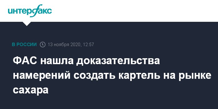 Москва. 13 ноября. INTERFAX.RU - У Федеральной антимонопольной службы (ФАС) есть документы, которые свидетельствуют, что участники рынка сахара могли планировать создать картель, сообщили в пресс-службе ведомства. ФАС намерена завершить расследование этого дела к началу 2021 года.