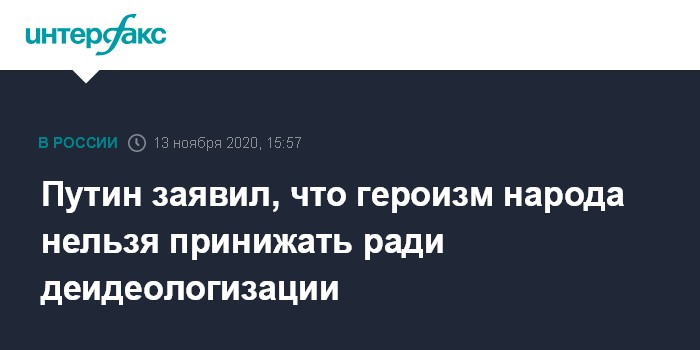 Москва. 13 ноября. INTERFAX.RU - Президент России Владимир Путин заявил, что деидеологизация истории Великой Отечественной войны не должна приводить к принижению героизма народа.