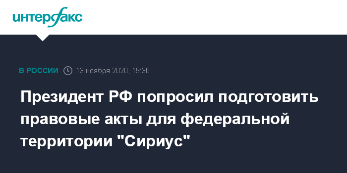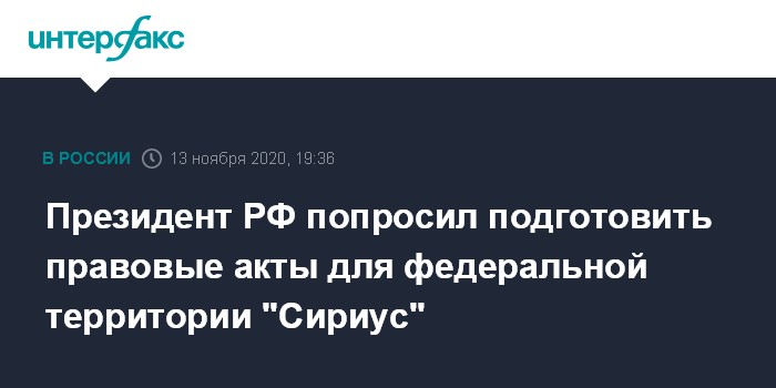 "Я прошу правительство своевременно подготовить все необходимые правовые акты для функционирования в том числе в переходный период федеральной территории "Сириус", а также обеспечить экономическую основу ее деятельности. Повторю, что все решения должны вступать в силу уже со следующего, 2021 года", - сказал глава государства.