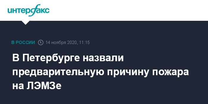 Москва. 14 ноября. INTERFAX.RU - Предварительной причиной крупного пожара на территории бывшего Ленинградского электромеханического завода (ЛЭМЗ) в Петербурге считается короткое замыкание, сообщил "Интерфаксу" в субботу информированный источник.