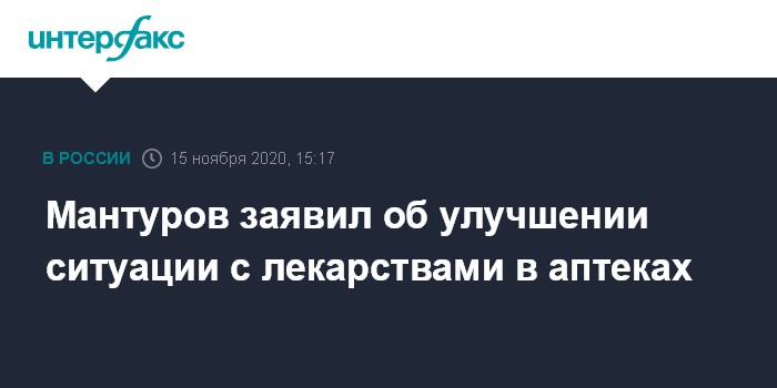 Москва. 15 ноября. INTERFAX.RU - Производители вышли на максимальные мощности по производству лекарственных препаратов, ситуация с их наличием в аптеках улучшается, заявил глава Минпромторга Денис Мантуров.