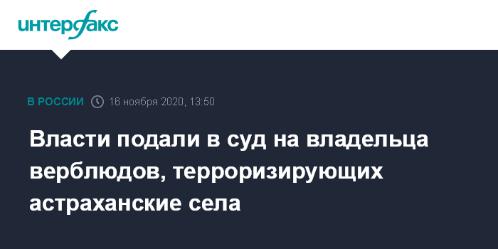 Москва. 16 ноября. INTERFAX.RU - Икрянинский районный суд Астраханской области принял иск районной администрации к местному жителю, чье стадо верблюдов свободно бродит в трех селах и пугает местных жителей, сообщил "Интерфаксу" заместитель главы района Александр Степанов.
