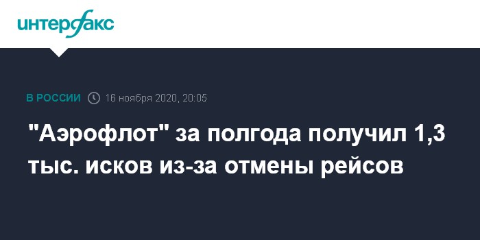 Москва. 16 ноября. INTERFAX.RU - "Аэрофлот" в период с апреля по конец сентября получил около 1,3 тыс. исков пассажиров, связанных с возвратом денег за отмененные из-за COVID-19 рейсы, говорится в квартальной отчетности компании.