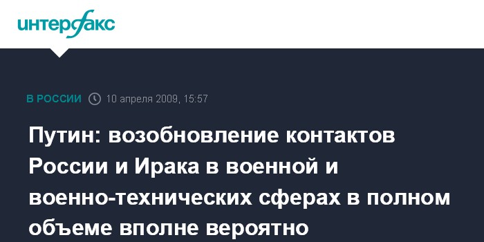 "Мы отмечаем заинтересованность иракских партнеров в возобновлении военного и военно-технического сотрудничества. Эти переговоры у нас находятся в стадии практических контактов. Считаю, что их возобновление в полном объеме вполне вероятно", - сказал В.Путин на пресс-конференции после переговоров в Москве с премьером Ирака Нури аль-Малики.