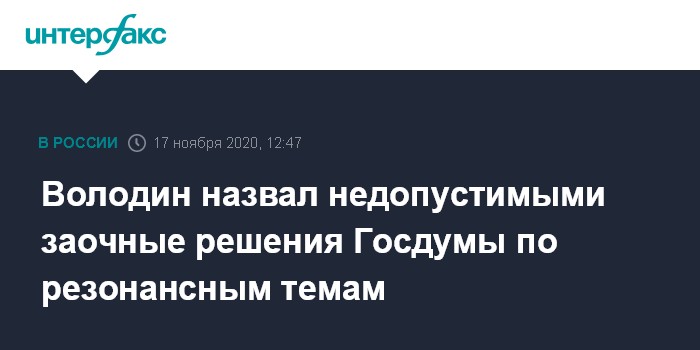 "Это (заочное принятие решений - ИФ) недопустимо, уважаемые председатели комитетов. Какие бы вопросы вы в будущем ни рассматривали - но только очное участие депутатов, если речь идет о наших гражданах, если мы говорим о резонансных вопросах, а вопросы семьи, детей у нас очень важные", - сказал Володин на заседании Госдумы.