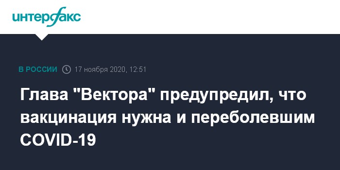 Москва. 17 ноября. INTERFAX.RU - Переболевшие COVID-19 не смогут сохранить иммунитет навсегда, им, как и еще не болевшим, потребуется вакцинация, предупредил директор государственного научного центра "Вектор" Роспотребнадзора Ринат Максютов. Он сказал это на виртуальном симпозиуме "Пандемия COVID-19: вызов современной науке".
