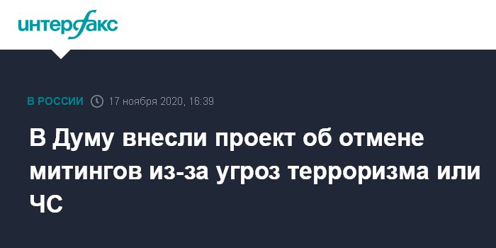 Документом (1057213-7) предлагается дать органам исполнительной власти и местного самоуправления право менять место и время проведения публичных мероприятий, "если в результате чрезвычайной ситуации, террористического акта либо при наличии реальной угрозы их возникновения (совершения) не может быть обеспечена безопасность участников публичного мероприятия при его проведении". В этом случае организатору вплоть до начала акции может быть направлено уведомление о том, что невозможно ее провести, будет предложено альтернативное время и место.