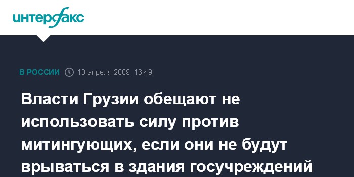 Москва. 10 апреля. INTERFAX.RU - Власти Грузии обещают не использовать силу против сторонников оппозиции, если их акции будут проходить мирно, однако выполнять требования оппозиции не намерены.