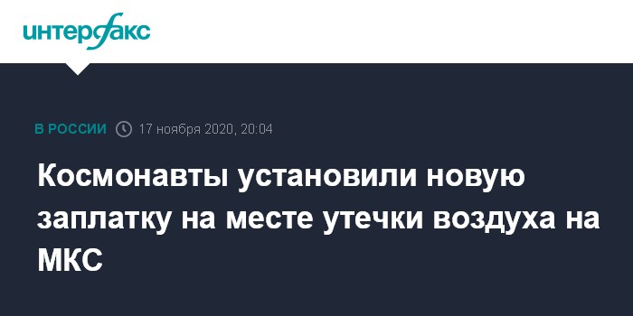 Москва. 17 ноября. INTERFAX.RU - Новая заплатка установлена на предполагаемом месте утечки воздуха на Международной космической станции (МКС), сообщили в "Роскосмосе".