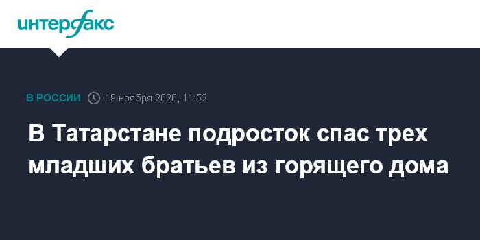 Москва. 19 ноября. INTERFAX.RU - В Алексеевском районе Татарстана утром сгорел одноэтажный деревянный жилой дом, где находились четверо детей. 14-летний Иван Павлинов спас из огня трех младших братьев, сообщили в региональном ГУ МЧС.