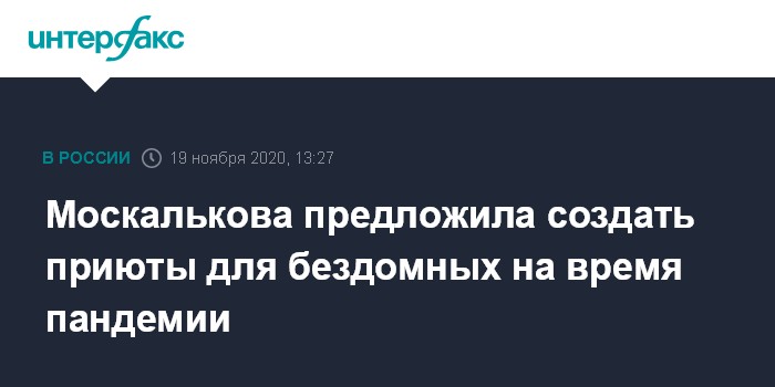 Москва. 19 ноября. INTERFAX.RU - Уполномоченный по правам человека в России Татьяна Москалькова призвала создать временные приюты для бездомных в период пандемии и раздавать им маски и средства личной гигиены. Она также поддержала просьбу к правительству разработать правила по лечению бездомных с коронавирусом.