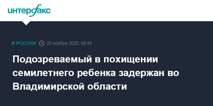 Москва. 20 ноября. INTERFAX.RU - Во Владимирской области сотрудники полиции при силовой поддержки Росгвардии задержали подозреваемого в похищении семилетнего ребенка, сообщила в пятницу официальный представитель МВД России Ирина Волк.