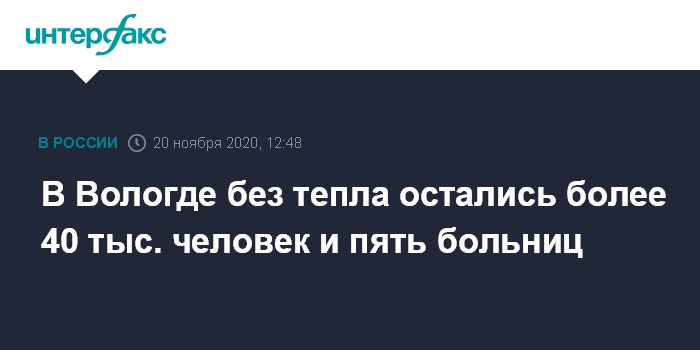Москва. 20 ноября. INTERFAX.RU - В зоне отключения теплоснабжения из-за обрушившейся трубы котельной подшипникового завода в Вологде оказались более 40 тысяч человек, сообщает пресс-служба областного ГУ МЧС.