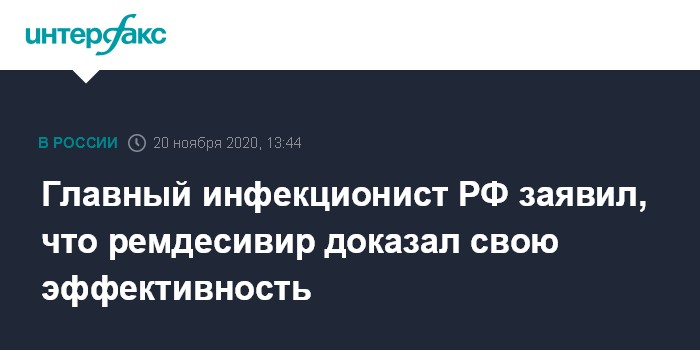 Москва. 20 ноября. INTERFAX.RU - Лекарство от коронавируса "ремдесивир" доказало свою эффективность, поэтому было включено в рекомендации Минздрава, заявил главный внештатный специалист Минздрава России по инфекционным болезням, профессор Владимир Чуланов.