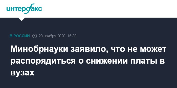 Москва. 20 ноября. INTERFAX.RU - Министерство науки и высшего образования РФ не может начать процесс снижения вузами стоимости обучения при переходе на дистанционную форму обучения, сообщили в ведомстве.