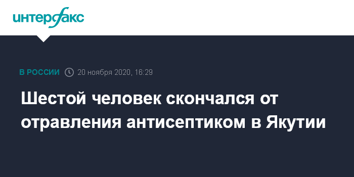 Ранее сообщалось, что девять человек отравились в Якутии, по предварительной версии, выпив антисептик. Трое из них скончались сразу, остальные были госпитализированы в районную больницу. Двое умерли на больничной койке. Возбуждено уголовное дело по части 3 статьи 109 УК РФ (причинение смерти по неосторожности двум и более лицам).