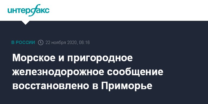 Москва. 22 ноября. INTERFAX.RU - Морские пассажирские перевозки на острова Попова, Рейнеке и Путятин возобновлены в Приморье, также восстановлены пригородные железнодорожные перевозки, сообщает в воскресенье главное управление МЧС России по Приморскому краю.