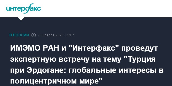 Москва. 23 ноября. INTERFAX.RU - В четверг, 26 ноября, в 11:30 состоится вторая экспертная встреча в рамках совместного проекта ИМЭМО-"Интерфакс" "Россия и мир: профессиональный разговор" на тему "Турция при Эрдогане: глобальные интересы в полицентричном мире".