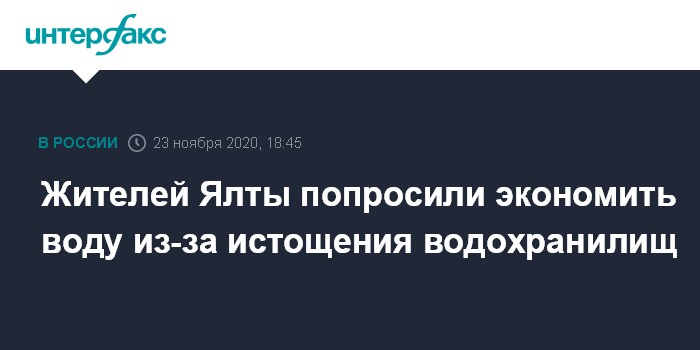 Москва. 23 ноября. INTERFAX.RU - Водоканал Южного берега Крыма призывает жителей Ялты экономнее расходовать воду, поскольку запасы в двух водохранилищах, снабжающих юг полуострова, истощены из-за отсутствия осадков.