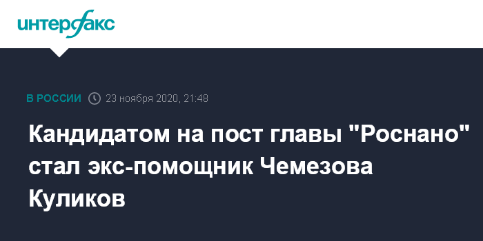 Москва. 23 ноября. INTERFAX.RU - Кандидатом на пост главы "Роснано" стал первый заместитель председателя коллегии Военно-промышленной комиссии Сергей Куликов, сообщило РБК со ссылкой на собственные источники.