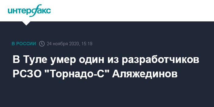 "24 ноября на 63-м году ушел из жизни заслуженный конструктор Российской Федерации, главный конструктор направления реактивных систем залпового огня НПО "СПЛАВ" им. А.Н. Ганичева Аляжединов Вадим Рашитович", - говорится в сообщении.