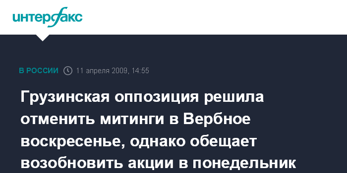 Москва. 11 апреля. INTERFAX.RU - Лидеры грузинской оппозиции в ходе совещания в субботу приняли решение отменить акции протеста 12 апреля, когда отмечается Вербное воскресенье.