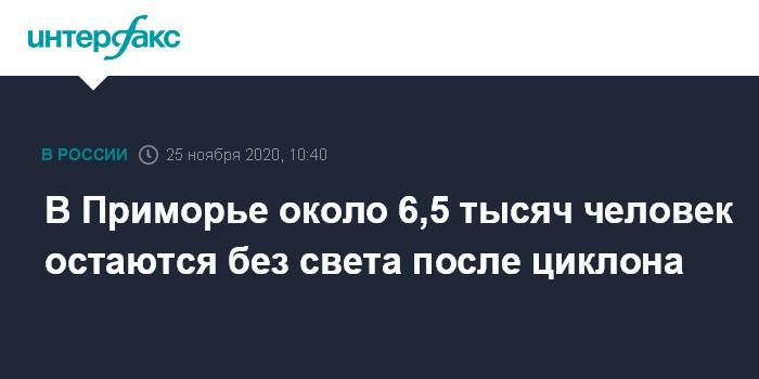 Москва. 25 ноября. INTERFAX.RU - Энергетики седьмой день устраняют аварии на сетях после прошедшего 19 ноября на юге Приморья циклона, без света остаются 6 550 тысяч человек, в том числе во Владивостоке. Таковы данные Минэнерго на 8:00 среды по московскому времени.